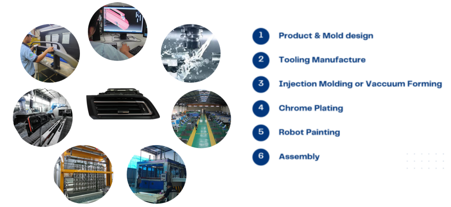 We provide services for product and mold design, tooling manufacture, injection molding or vaccum forming, chrome plating, robot painting, assembly.